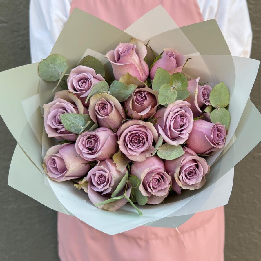 На фото букет из 15 фиолетовых роз. В составе: роза 15 шт, дизайнерская упаковка 1 шт, атласная лента 1 шт, . Все цветы свежие и ароматные, букет красиво оформлен и отлично подходит для подарка. Доступна доставка цветов или самовывоз.