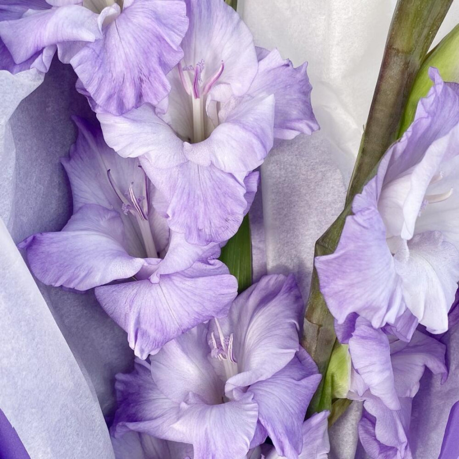 На фото букет из 3 сиреневых гладиолусов. В составе: гладиолус 3 шт, дизайнерская упаковка 1 шт, атласная лента 2 шт, . Все цветы свежие и ароматные, букет красиво оформлен и отлично подходит для подарка. Доступна доставка цветов или самовывоз.