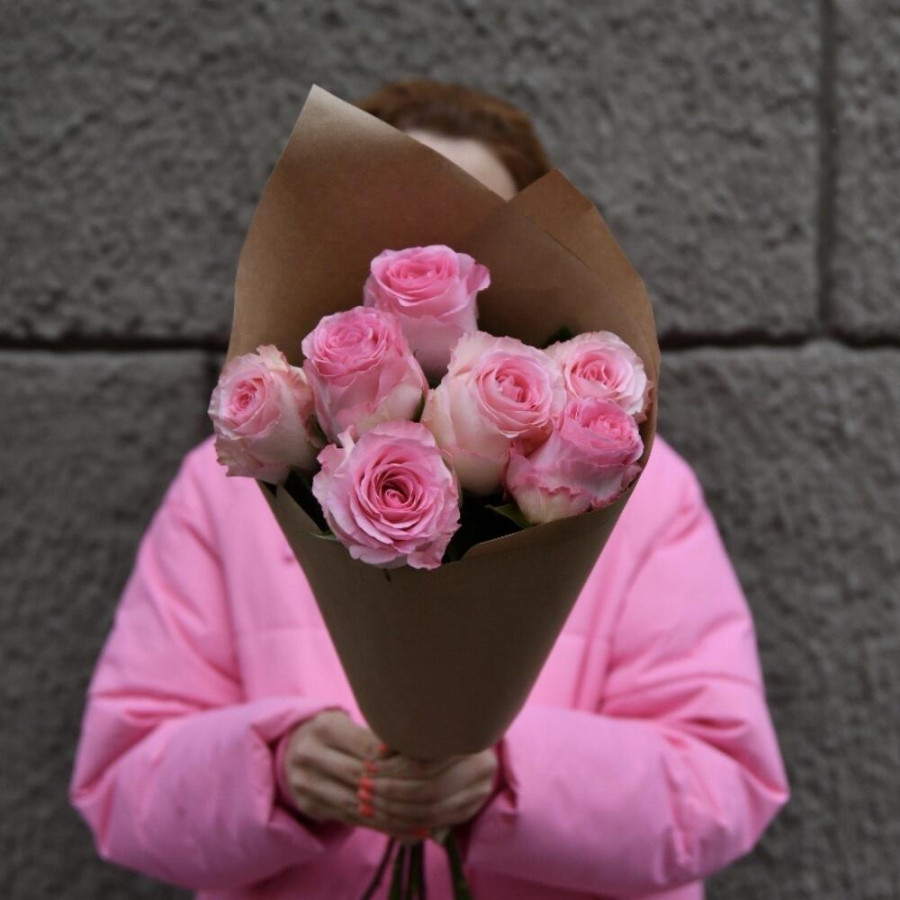 На фото букет из 7 розовых роз. В составе: роза 7 шт, дизайнерская упаковка 1 шт, атласная лента 1 шт, . Все цветы свежие и ароматные, букет красиво оформлен и отлично подходит для подарка. Доступна доставка цветов или самовывоз.