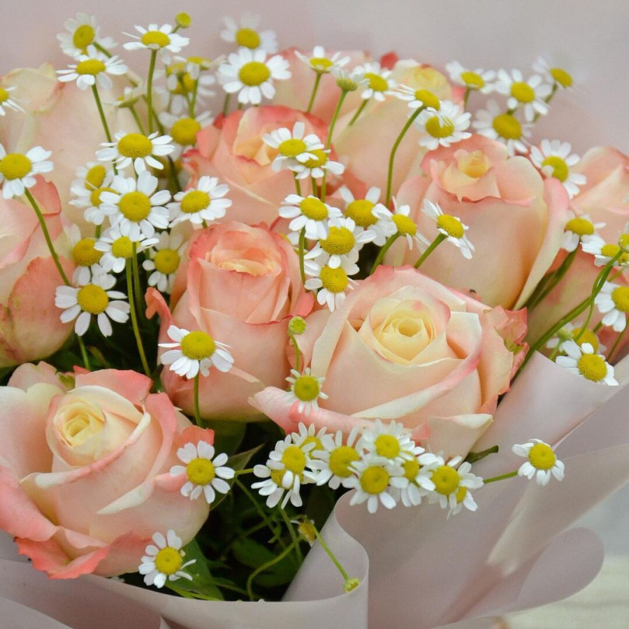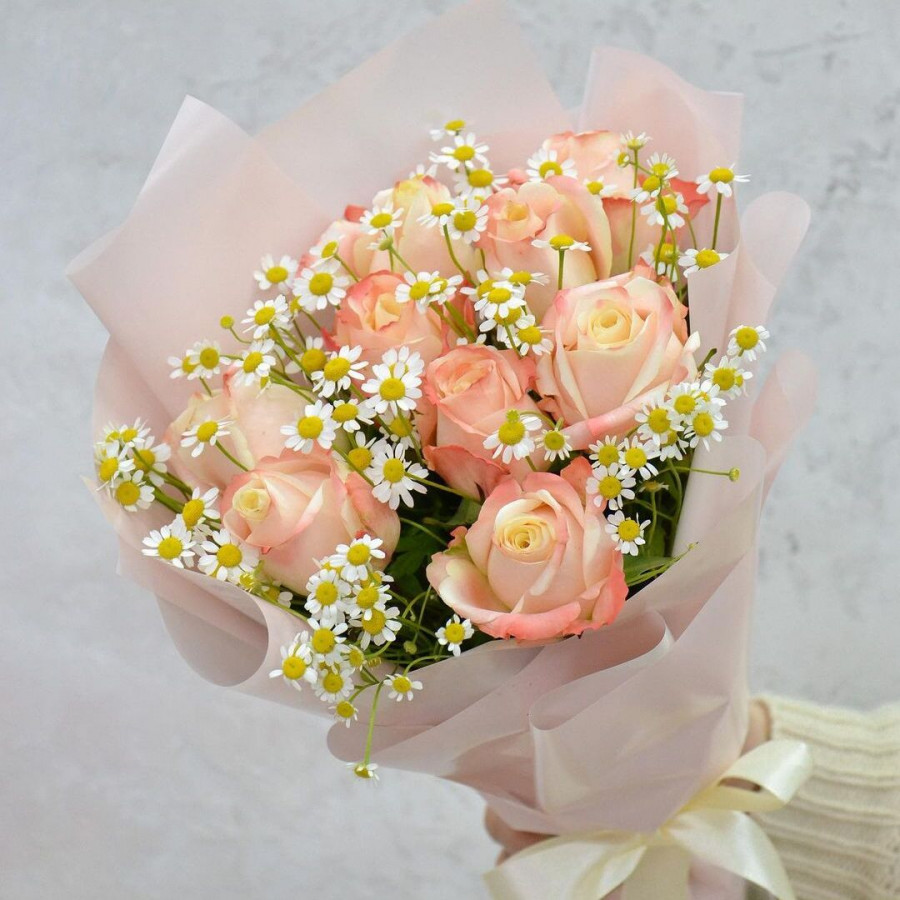На фото букет из розовых роз и ромашек. В составе: роза 11 шт, танацетум 4 шт, крафт-бумага 1 шт, атласная лента 1 шт, . Все цветы свежие и ароматные, букет красиво оформлен и отлично подходит для подарка. Доступна доставка цветов или самовывоз.